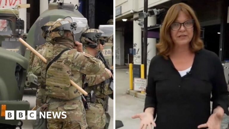 BBC on the ground as National Guard set up in Los Angeles The BBC's Regan Morris reports from outside a federal building, where there have been violent clashes over the past few... News 8 months ago